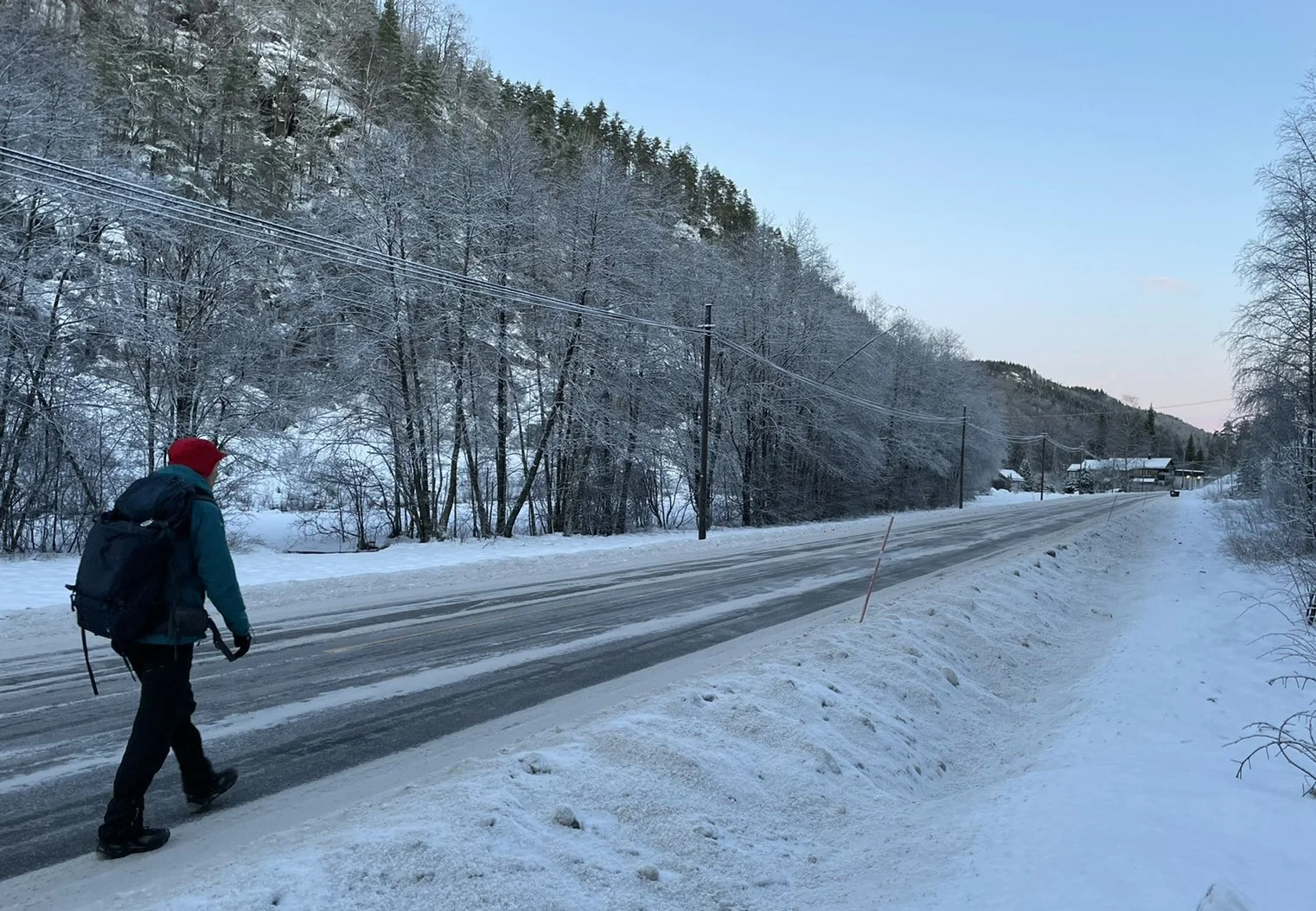For those readers who keep complaining about a lack of skis, yes, we could’ve skied a few miles today, but the road would’ve trashed the skis. Besides our skis are in Ljosland, 36 miles away. So, on we trudge.