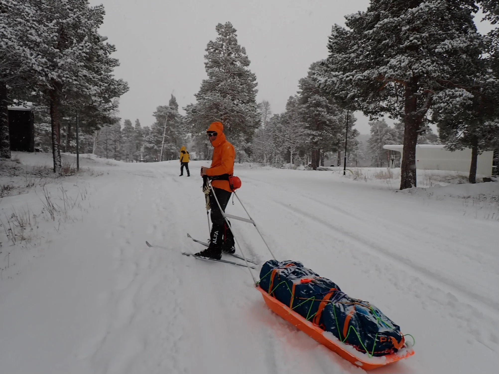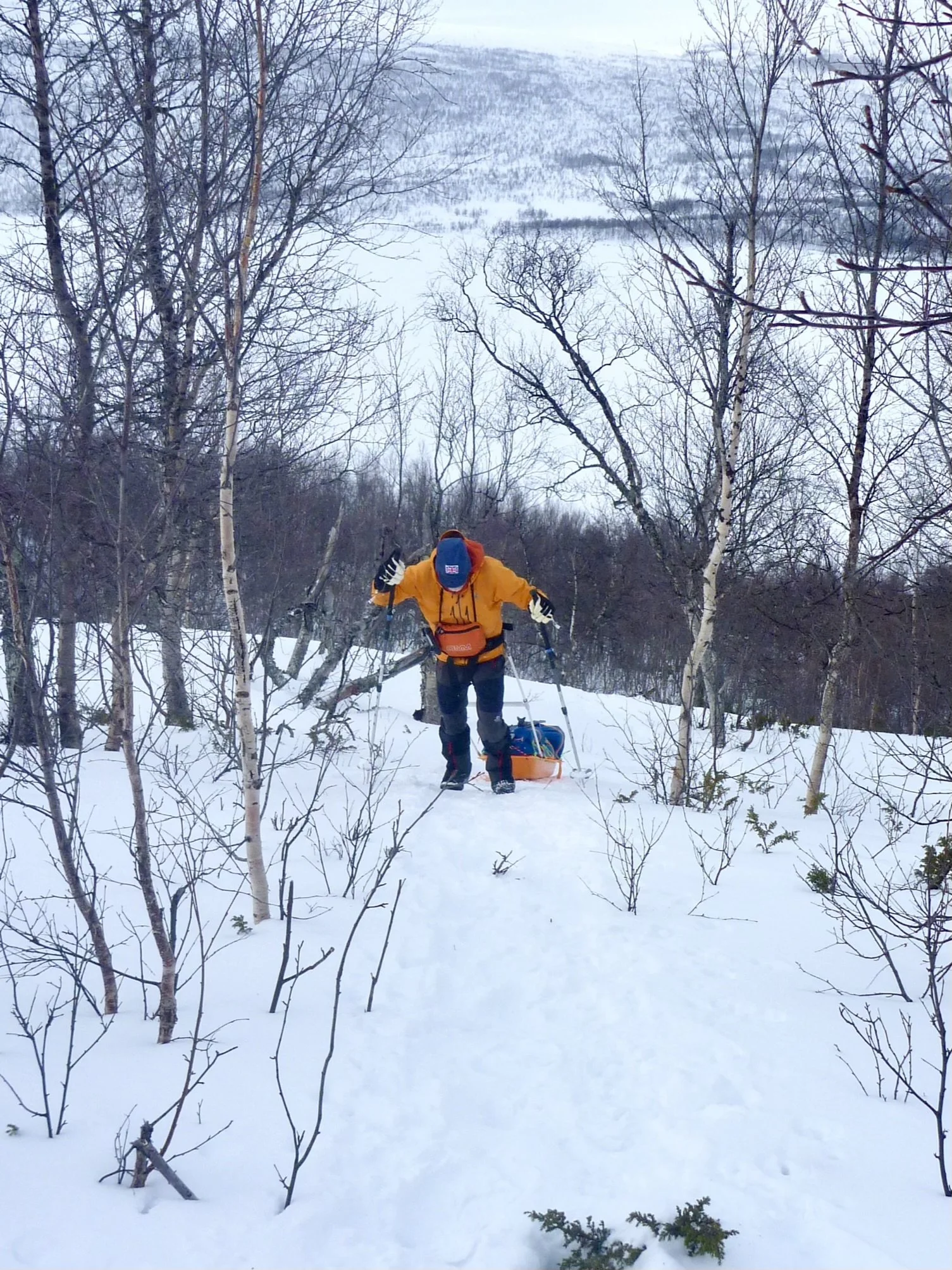 All the signs were there. A narrow gap of less than 30 meters between the bank and the small island. Small patches of open water at either side. I have no idea why I thought this was a good idea. Tired, complacent, stupid? All of the above? Suddenly, very suddenly, the ice below my right ski broke under my weight and I went through. I had no time to think but remember immediately shifting my weight to my left ski which immediately broke through the thin ice too. I fell sideways onto the leads of my pulk. Both legs in the frigid water. I should have been terrified that my weight would break the ice and I would go completely in, but there was no time to be afraid only time to react. The ice hadn’t broken where I now lay. I was okay. For now. Pulky’s leads that I had fallen on were possibly helping spread my weight. Mrs P was thankfully not too close behind and I shouted to her to go left and get onto the island. As soon as she was there she removed her skis and started getting her pulk ready should she need to push it out to help me (the pulks are like small boats and will float if not loaded too heavily). By that time I had extricated my legs from the water and was dragging myself sideways, pushing with my skis to get away from the ‘me’ shaped hole in the ice, dragging Pulky sideways with me. ‘What shall I do?’ Shouted Mrs P. I honestly nearly said, ‘Take a photo. It will look great on the blog.’ But I was convinced the ice beneath me would give way any minute so thought better of it. Besides, she was doing all she could and had prepared herself already in case I did go through again.