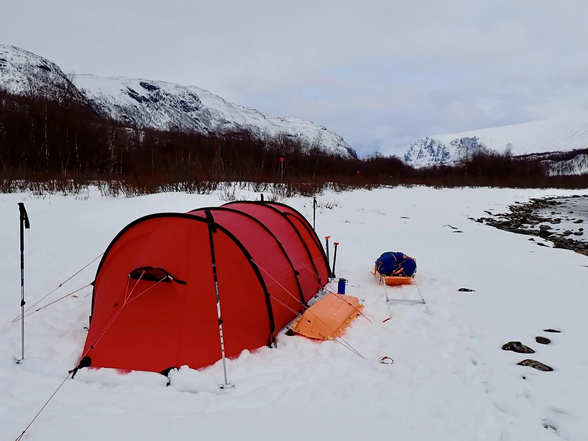 We ate up the kilometres (but not the miles, for they are longer, we only nibbled at those) along a marked route this time at the edge of the lake due to dangerous ice and found our best camp spot yet, on the bank of an unfrozen river. No need to spend an hour digging a platform for the tent in rotten snow and no need to melt snow for water with access to the river. Deep joy. Very happy campers.