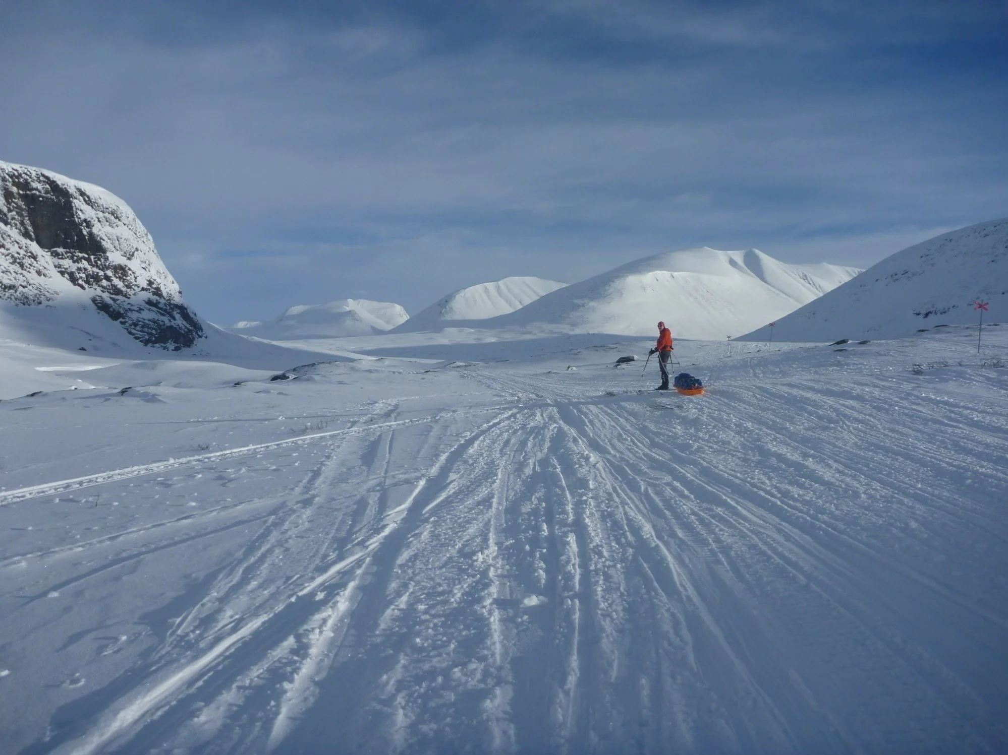 The track went straight up from the hut. Totally unskiable, even with skins. In places, crampons and an axe would’ve been more appropriate. It was too steep for Mrs P, who at a mere 56kg was unable to shift her 20kg pulk in the steepest sections (most of it) so I had to do relays. Nearly 250 metres of ‘up.’ Twice! Such fun.