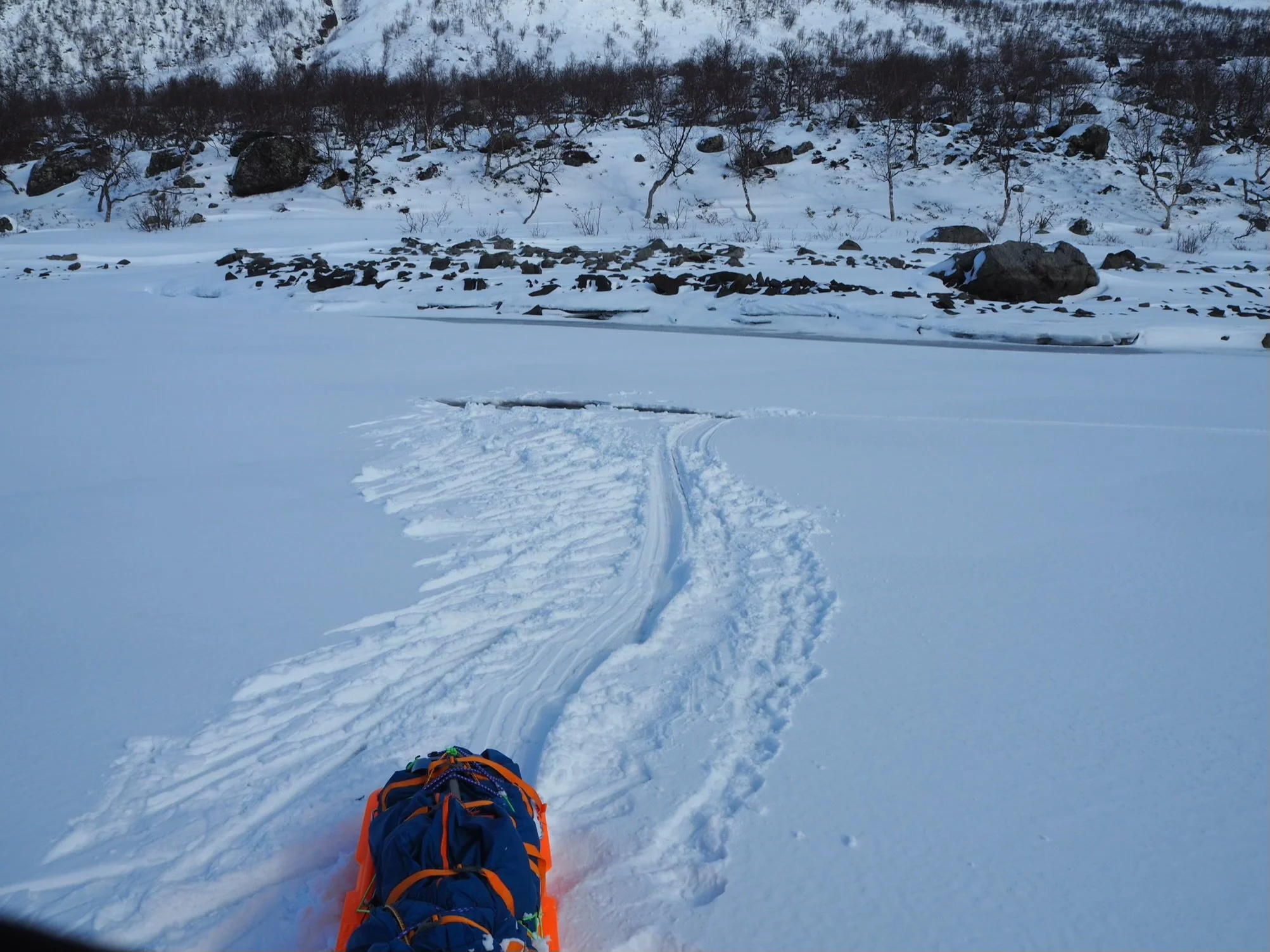 The drag marks, skis, me, elbows, pulk, away from the ‘me’ shaped hole in the ice.